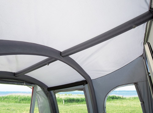 Het moderne Air-In-systeem van hoogwaardig HQ-doek (High Quality) maakt een snelle opbouw van de tent mogelijk. Grote tijdbesparing, minder handelingen, geringer gewicht. De beide luchtkamers worden met de pomp met dubbele werking snel met lucht gevuld. De afstandskussens in het dak stabiliseren bovendien het dakoppervlak.